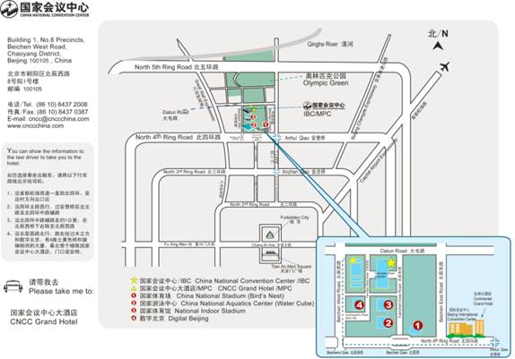 Sitting in the center of the Olympic commercial circle between Beijing's fourth and fifth ring roads, CNCC boasts an enviable location. It's only 30 minutes’ drive to the airport and the subway station is connected with CNCC's basement which enables people to quickly go to the city center, the airport, the Beijing Railway station, the central business district, China's silicon valley Zhongguancun, and many tourist attractions such as Tian'anmen Square, Forbidden City or Summer Palace. It takes only one hour from CNCC to the renowned Great Wall and Ming Tombs.